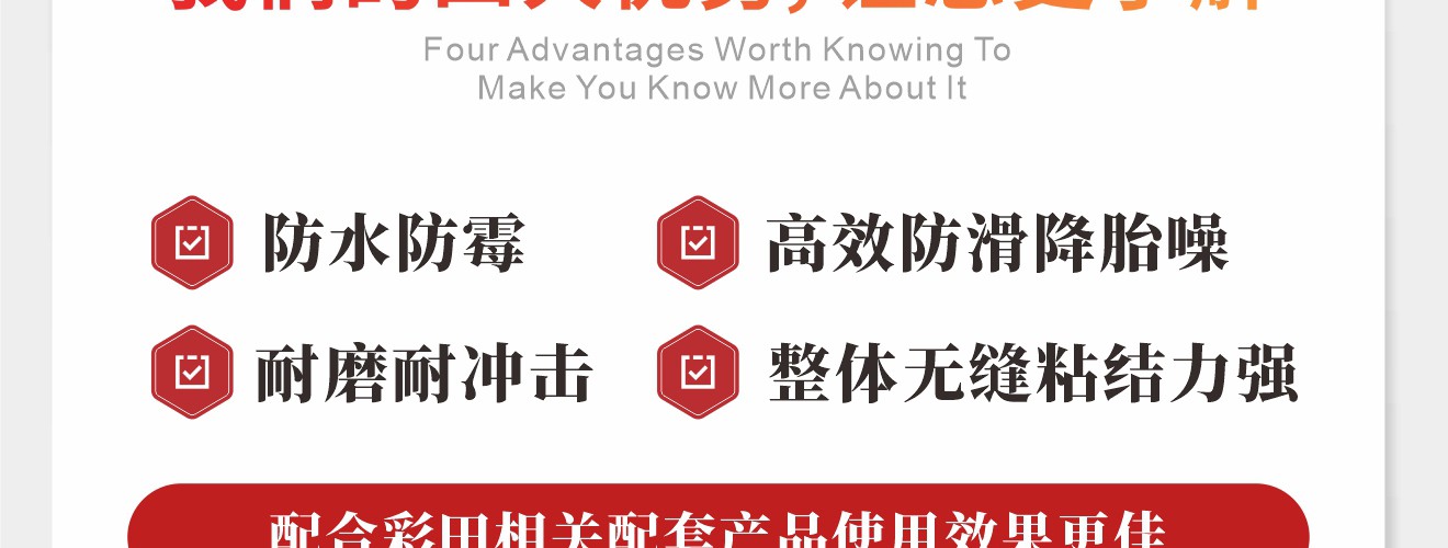 1、比一般薄涂型防滑材料的耐磨性好; 2、涂層呈現顆粒紋理,止滑效果好; 3、溶劑含量低,大大改善施工環境。 4、優異的抗劃傷能力;