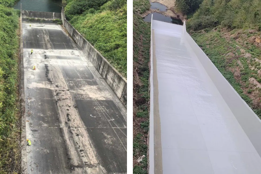 對(duì)基面打磨清理后使用彩田新型快速修復(fù)抗沖磨材料進(jìn)行修復(fù)找平(施工厚度3mm),后涂刷1mm氟改性高聚物降糙防護(hù)涂料進(jìn)行表面防護(hù)處理。