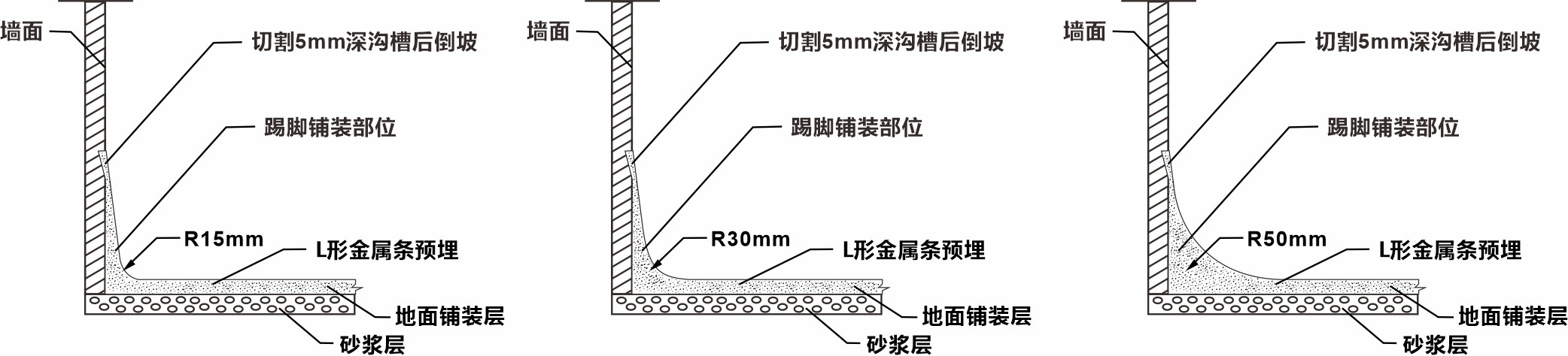 彩砂地坪最好的視覺效果和功能需要,這里需要做一些額外的努力,可以鋪裝出整潔的圓弧踢腳線,一個漂亮的圓弧踢腳線代表著優秀的施工工藝。(下圖表示出環氧彩砂地坪在踢腳線和立柱及設備基礎處收邊方法,用到的鏝刀規格分別是R15mm、R30mm、R50mm)。