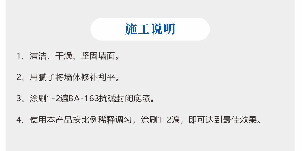 1、抗堿封閉底漆是一種抗堿性能力極強的水性乳膠漆底漆,施工性能優(yōu)良、流平性佳。 2、墻體附著力極佳,防水份滲漏好,抗藻類滋生能力強,可精心呵護墻體。 3、專為家庭裝修、工程建筑等內外墻面基礎裝飾而設計。