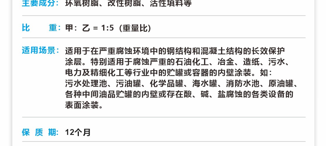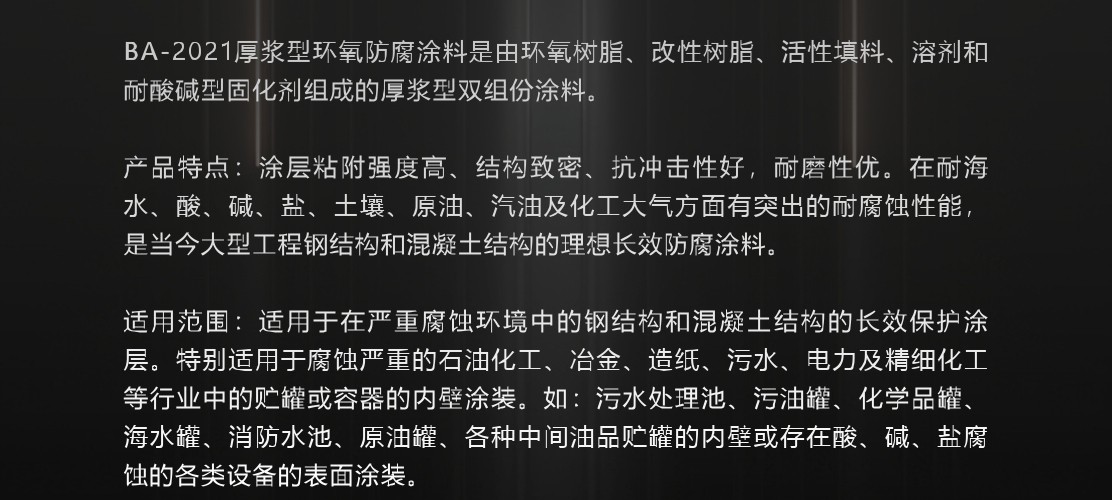 彩天化工 | 厚漿型環(huán)氧防腐涂料是由環(huán)氧樹脂、改性樹脂、活性填料、溶劑和耐酸堿型固化劑組成的厚漿型雙組份涂料。 產(chǎn)品特點(diǎn):涂層粘附強(qiáng)度高、結(jié)構(gòu)致密、抗沖擊性好,耐磨性優(yōu)。在耐海水、酸、堿、鹽、土壤、原油、汽油及化工大氣方面有突出的耐腐蝕性能,是當(dāng)今大型工程鋼結(jié)構(gòu)和混凝土結(jié)構(gòu)的理想長效防腐涂料。 適用范圍:適用于在嚴(yán)重腐蝕環(huán)境中的鋼結(jié)構(gòu)和混凝土結(jié)構(gòu)的長效保護(hù)涂層。特別適用于腐蝕嚴(yán)重的石油化工、冶金、造紙、污水、電力及精細(xì)化工等行業(yè)中的貯罐或容器的內(nèi)壁涂裝。如:污水處理池、污油罐、化學(xué)品罐、海水罐、消防水池、原油罐、各種中間油品貯罐的內(nèi)壁或存在酸、堿、鹽腐蝕的各類設(shè)備的表面涂裝。